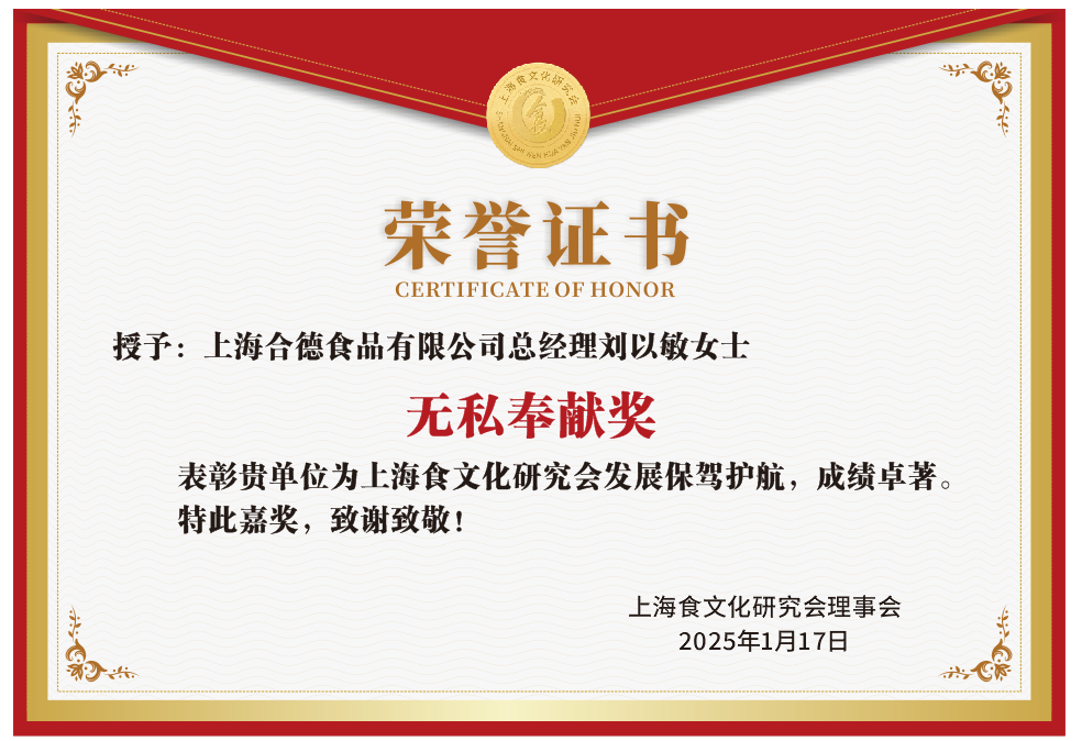 2、上海合德食品有限公司总经理刘以敏女士:获“无私奉献奖”,表彰其为研究会发展保驾护航、成绩卓著。